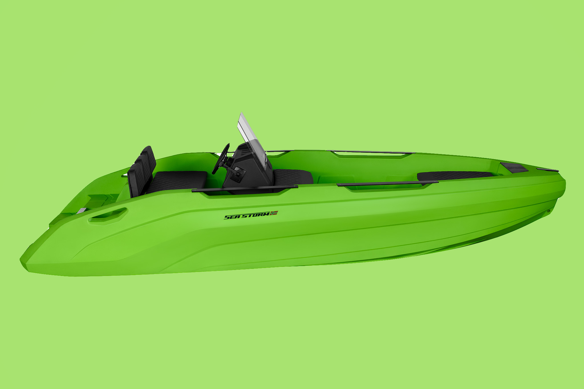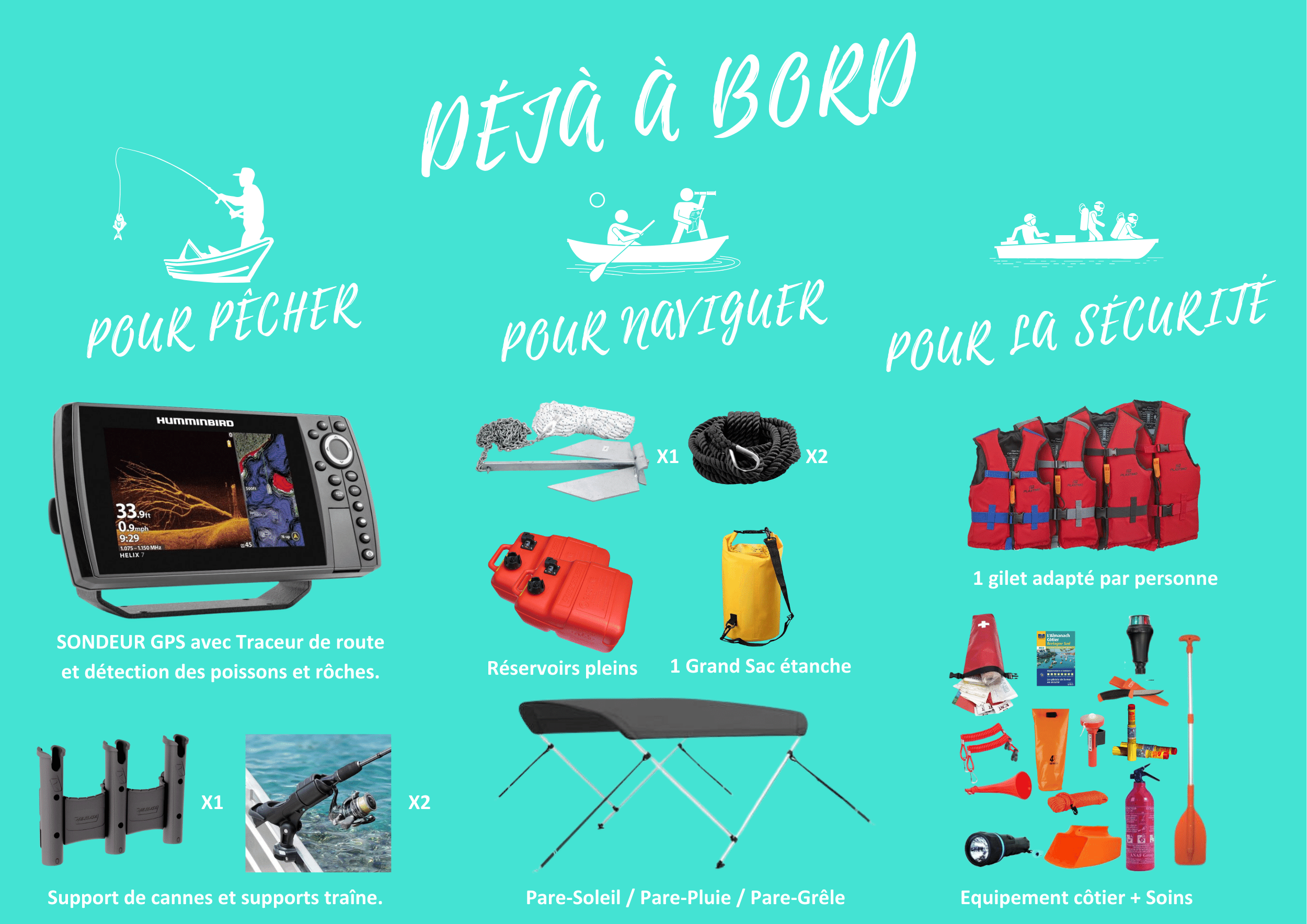 Model 4 personnes avec sièges confortables, pilotage central, bain de soleil avant et matériel de sécurité à bord.